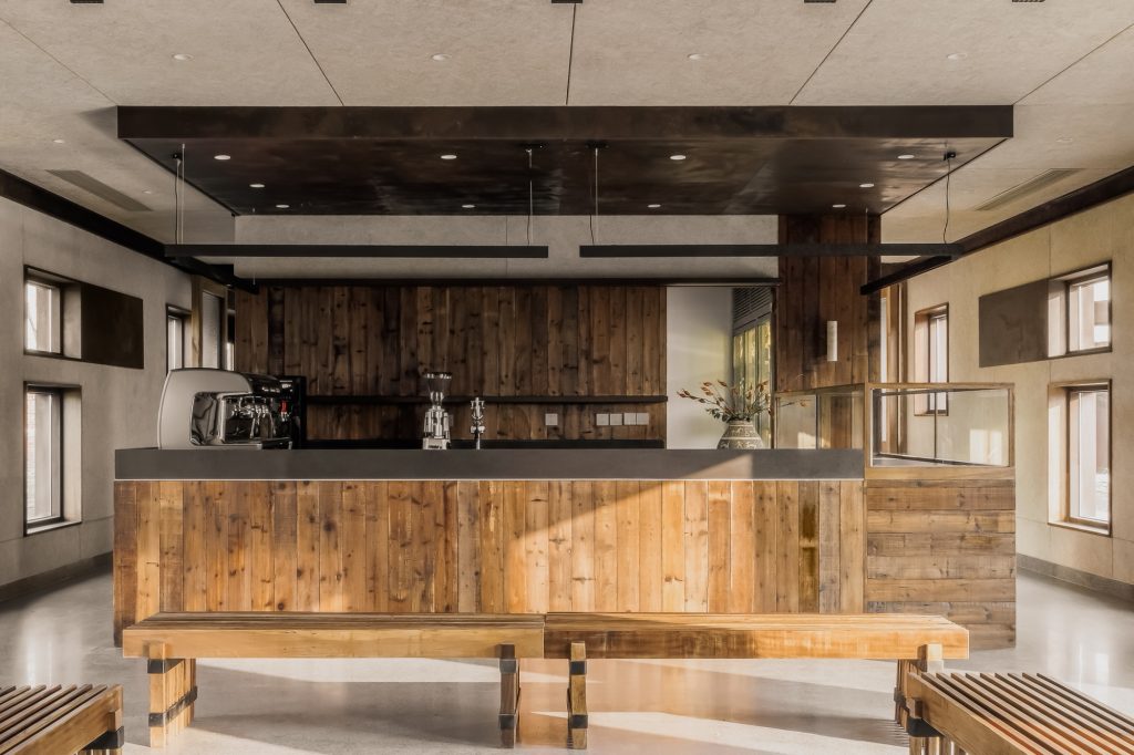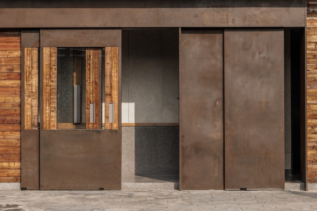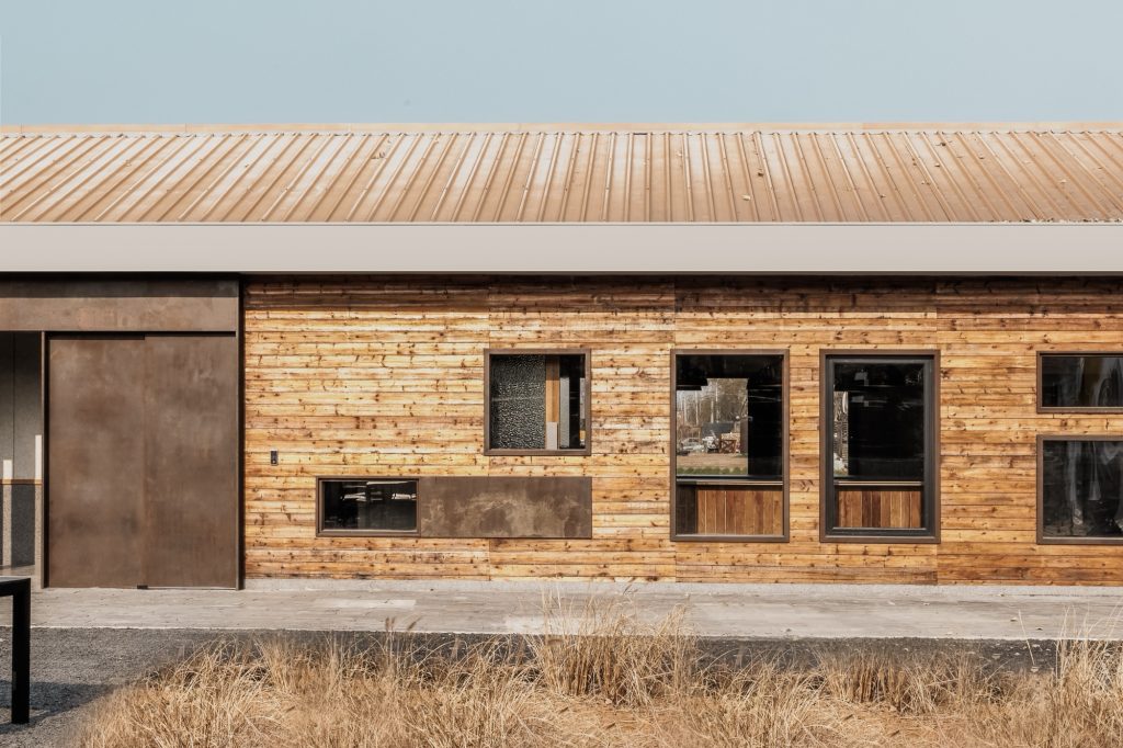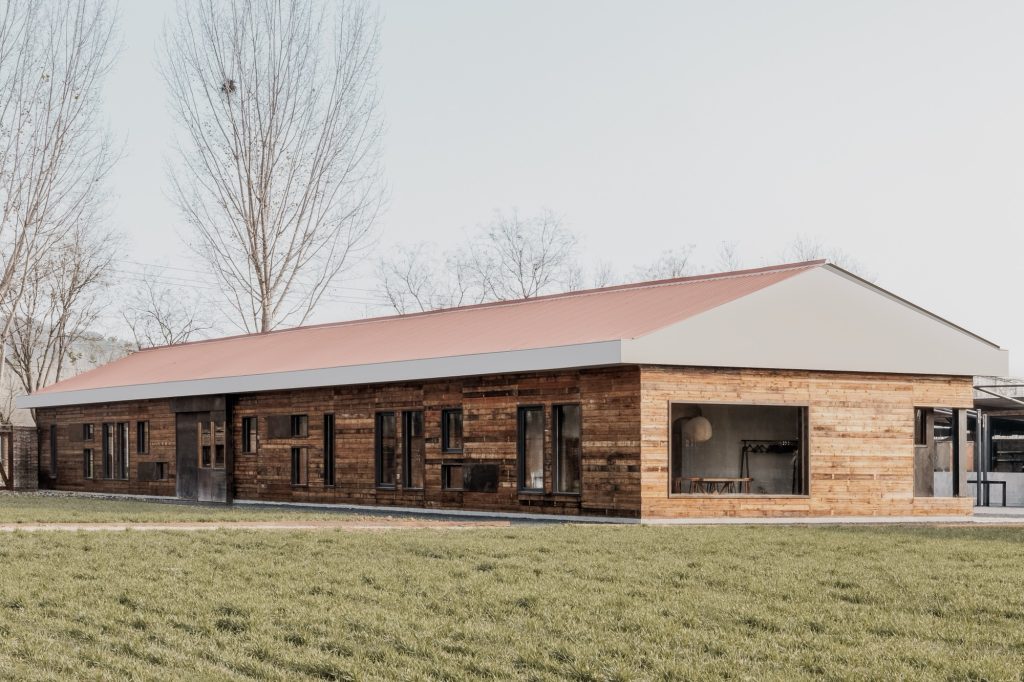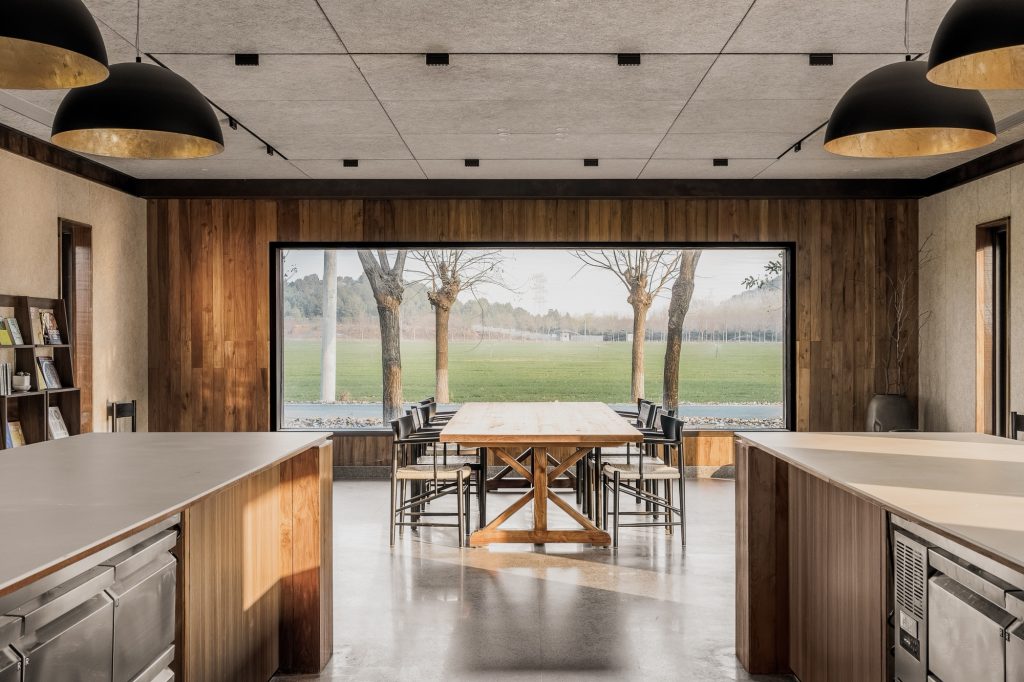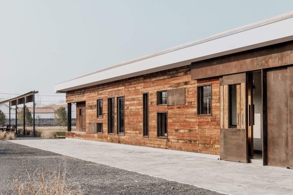 The renovation of the restaurant building preserves the original steel structure and corrugated steel roof, retaining the site’s industrial memory. Modular wall systems ensure thermal comfort across seasons, while carefully positioned vertical and horizontal windows on the north and south elevations frame views of the farmland. Exterior finishes of reclaimed timber and rusted steel plates echo agricultural tools and processes, allowing weathering to become part of the architecture’s expression.