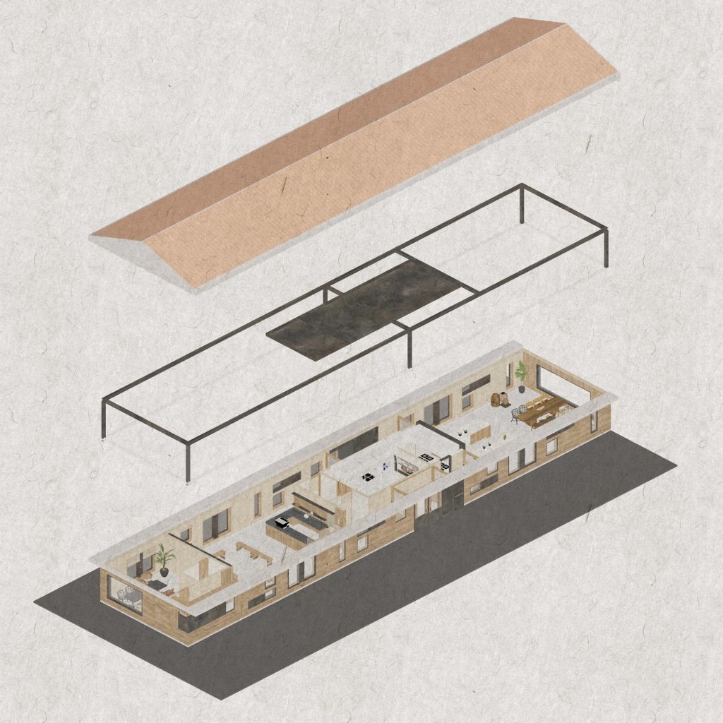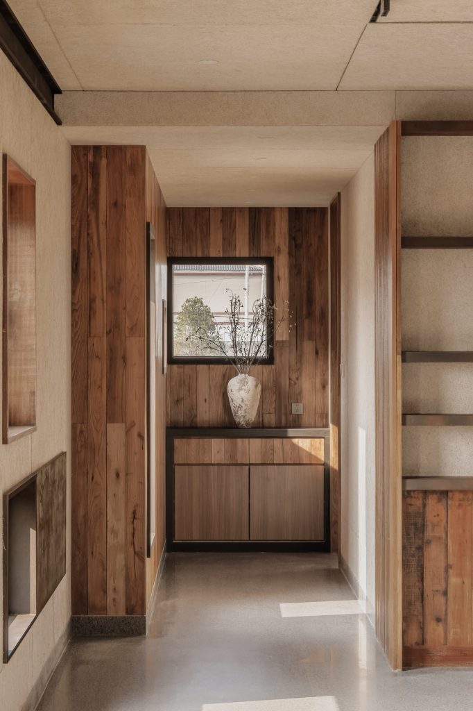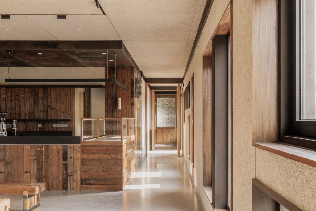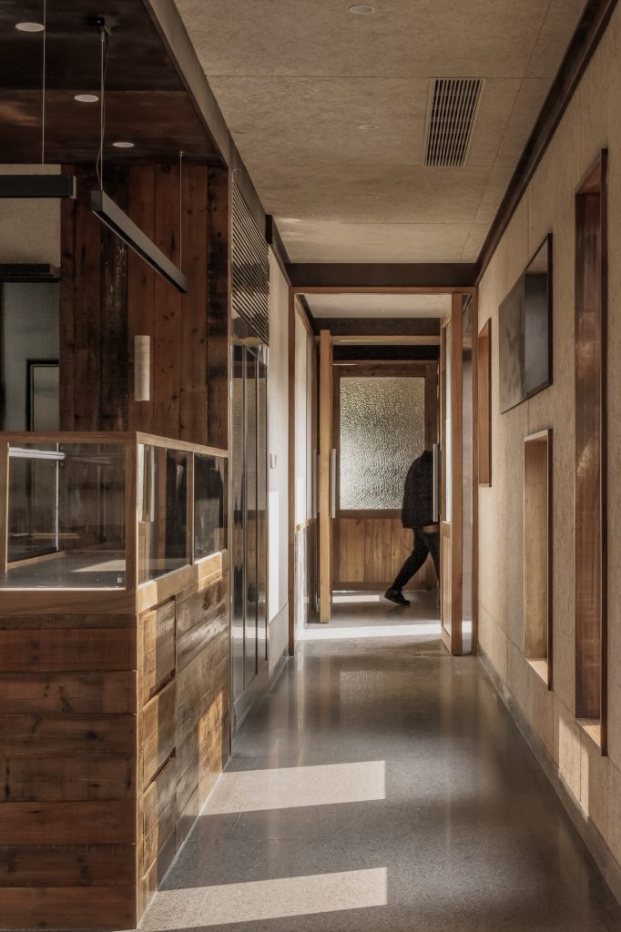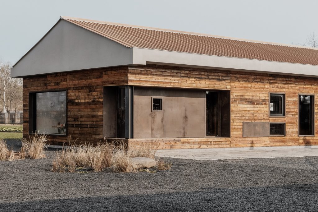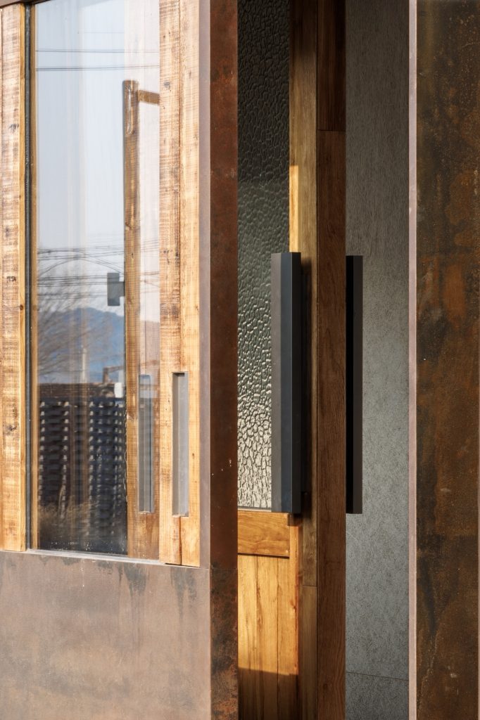 The renovation of the restaurant building preserves the original steel structure and corrugated steel roof, retaining the site’s industrial memory. Modular wall systems ensure thermal comfort across seasons, while carefully positioned vertical and horizontal windows on the north and south elevations frame views of the farmland. Exterior finishes of reclaimed timber and rusted steel plates echo agricultural tools and processes, allowing weathering to become part of the architecture’s expression.