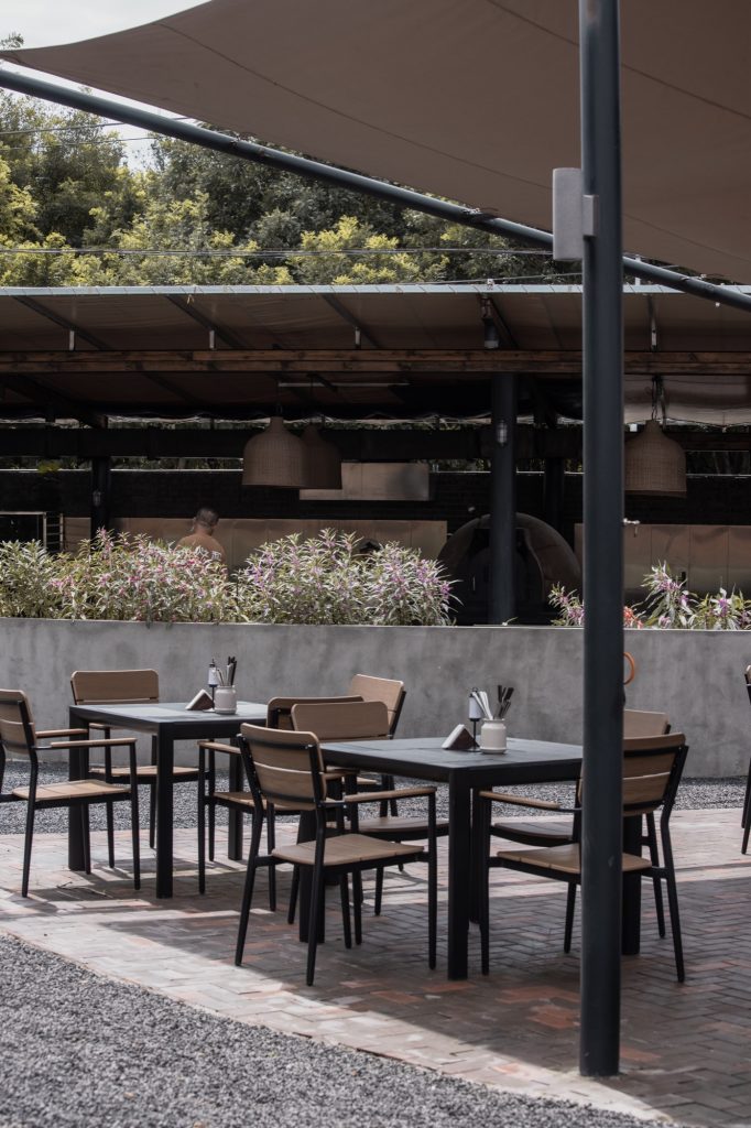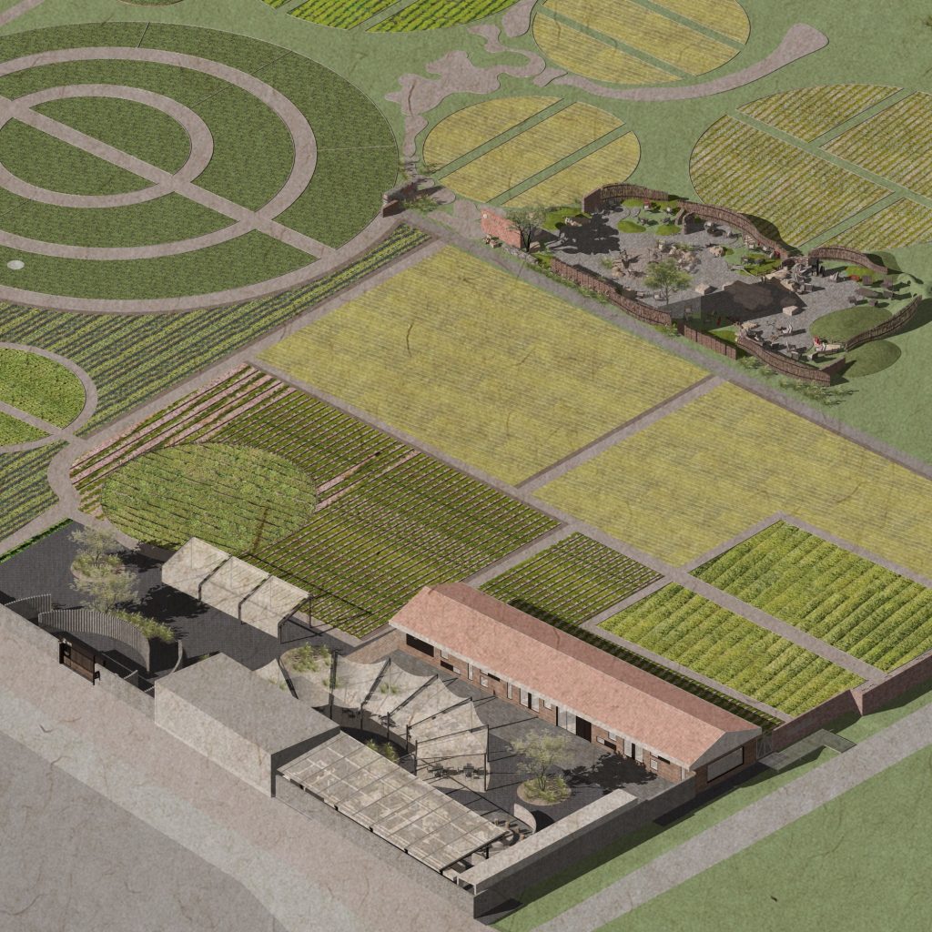 Outdoor dining areas are formed by parallel pitched roof canopies and fan shaped awnings that respond to the scale and language of existing structures. Crops define the ground plane, while fruit trees and shrubs are dispersed organically throughout the site. The resulting landscape feels both deliberate and unforced, a contemporary rural environment shaped by coexistence rather than contrast.