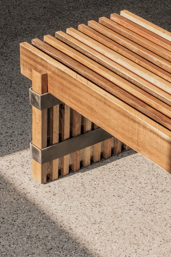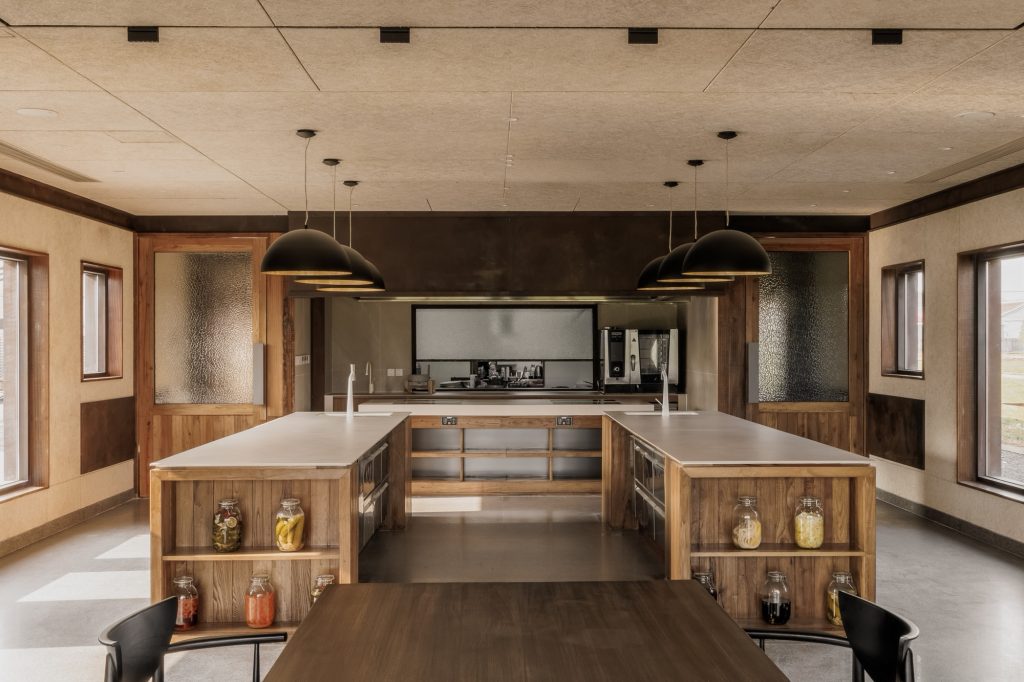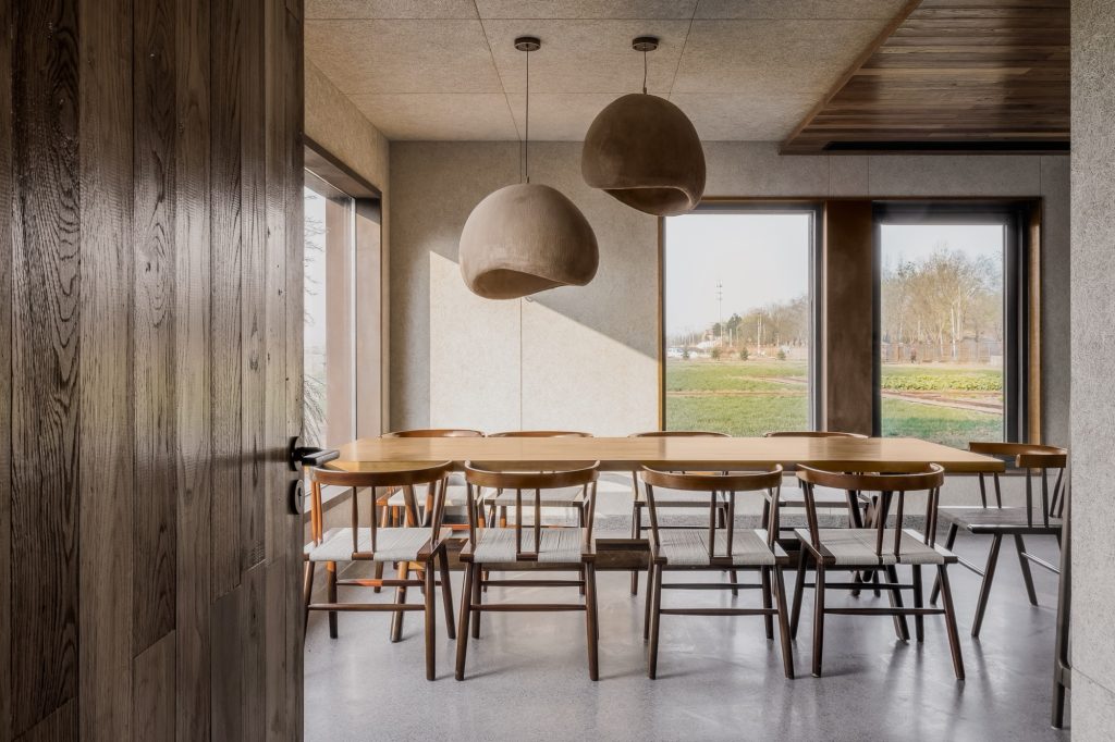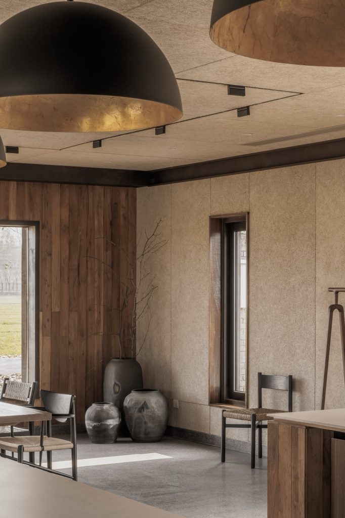 Inside, the atmosphere shifts toward quiet tactility. Wood fiber acoustic panels, reclaimed wood surfaces, and terrazzo flooring create a restrained interior that absorbs sound and light. Rather than isolating diners from the landscape, the interior maintains a constant visual dialogue with the fields outside, reinforcing the project’s central premise.