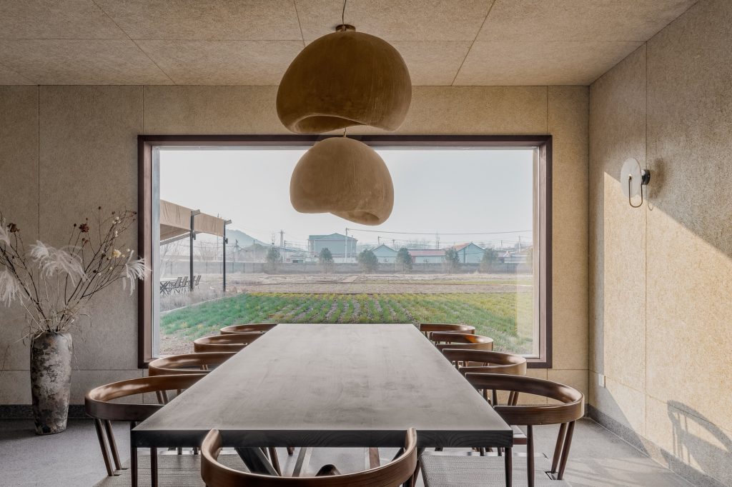 Spatial planning is organized around a centrally positioned circulation core, allowing flexible access from both the north and south. Openings can be adjusted to create distinct zones or a continuous dining environment. A large landscape window on the east anchors the interior, aligning a long communal table with the fields beyond, as if meals were set directly within the farmland. To the west, a coffee and beverage bar integrates seamlessly into the dining space, while a more secluded lounge area at the far end offers privacy for conversation and rest.