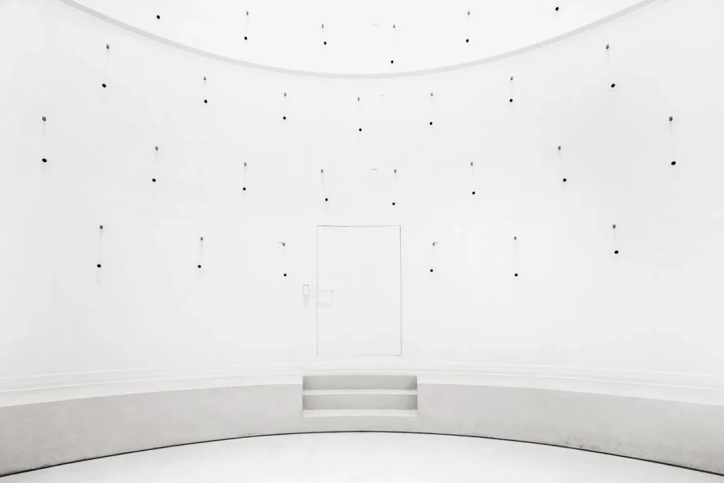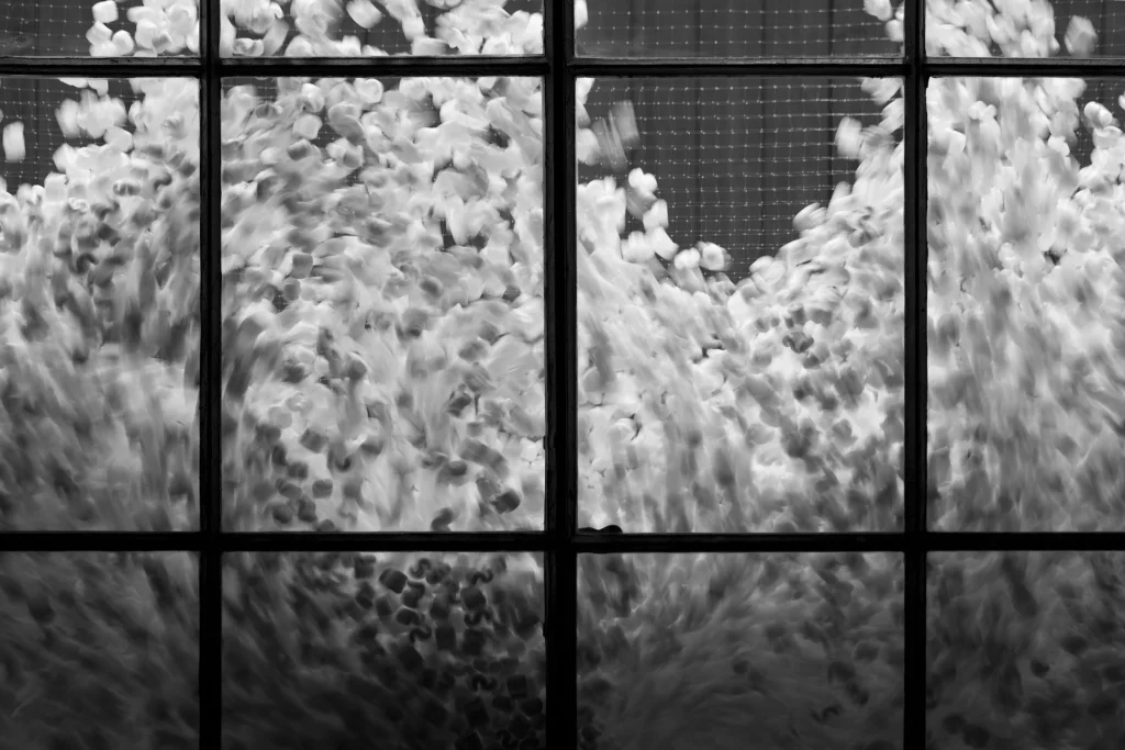 At the center of Zimoun’s practice lies a sustained investigation into the relationship between order and instability. Distribution is measured. Components are evenly structured. Yet deviation inevitably appears. The system is predetermined. The outcome remains open. Over time, micro differences accumulate into shifting acoustic fields. The absence of narrative directs attention toward perception itself. Visitors become aware of fluctuation within apparent uniformity. Complexity reveals itself gradually, through sustained listening.