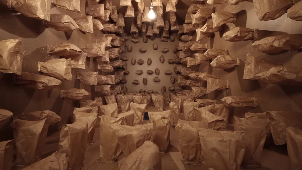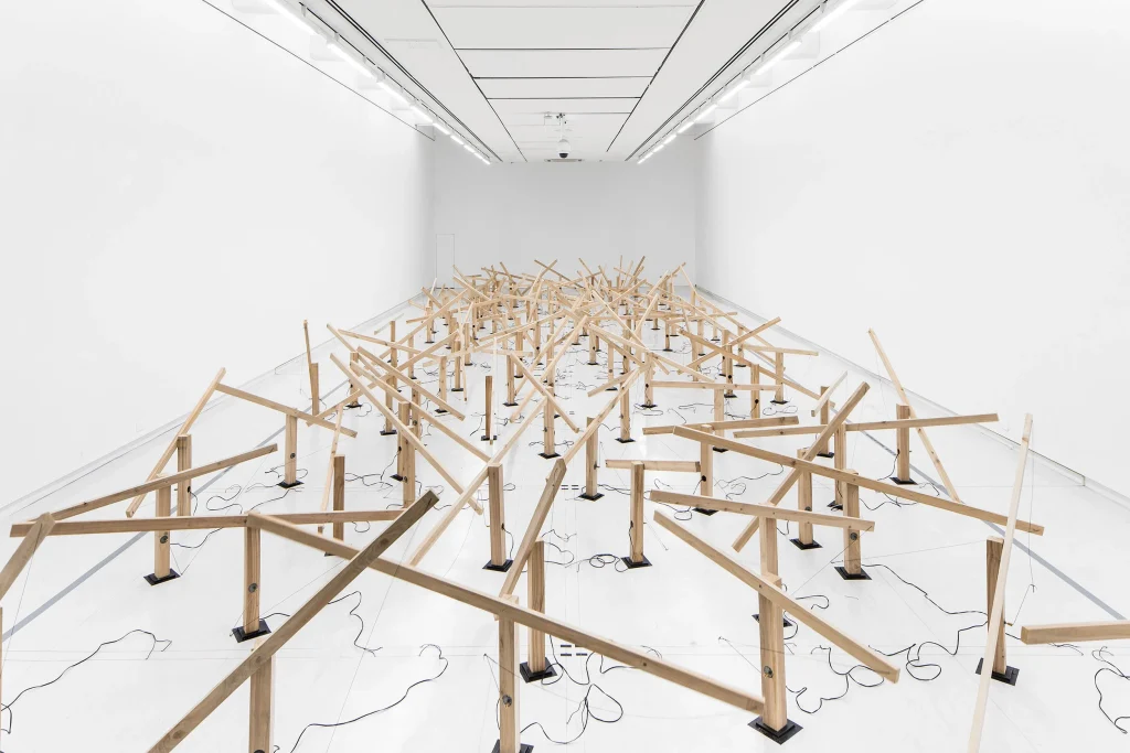 Zimoun’s material vocabulary is deliberately modest. Cardboard, cotton, rope, paper bags, wooden sticks, metal wire and industrial motors remain recognisable. There is no attempt to transform or disguise their origin.